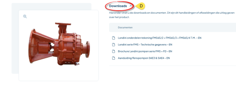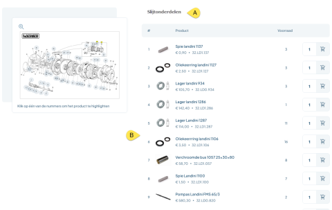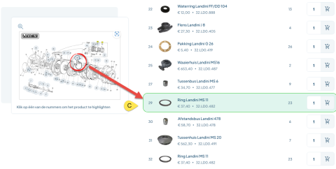 Zoek simpelweg de pomp in het zoekvenster, en onderaan de pagina ziet u een lijst met alle slijtonderdelen die gerelateerd zijn aan de onderdelen-tekening (B). Elk positienummer op de tekening is gelinkt aan het bijbehorende artikel in de lijst. Door op de tekening zelf te klikken (C) en een positienummer te selecteren, bijvoorbeeld nummer 29, komt u direct bij de slijtonderdelenlijst. Hier kunt u het betreffende onderdeel bekijken en eenvoudig bestellen.